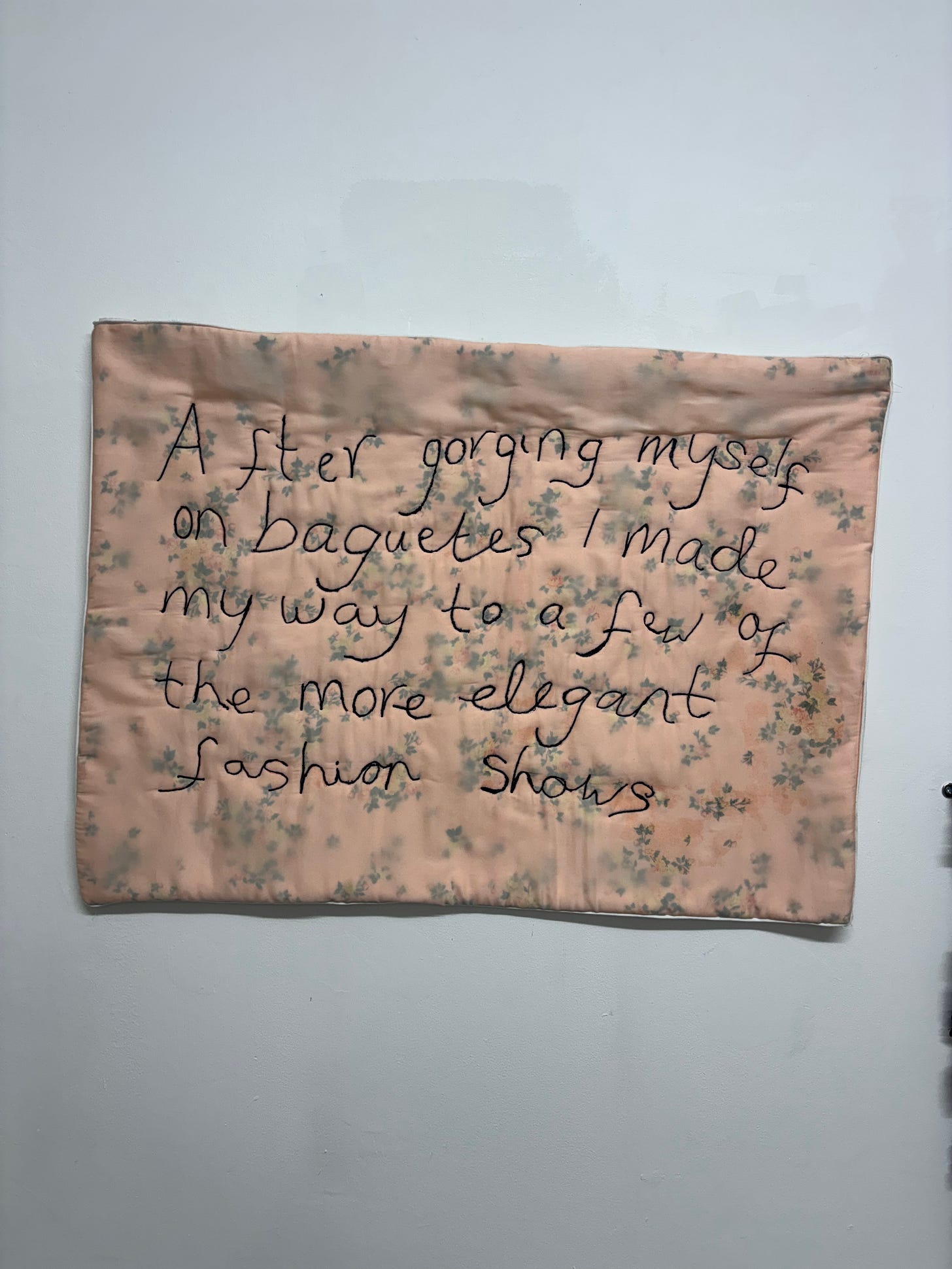 The witual involved us each bringing a piece of white thread or ribbon to gift as an offering to the moon. I needed extra luck from the moon (financially) and so brought a special Japanese ribbon, hoping that She (the moon) might be seduced by my effort. Is the moon a capitalist? Probably. In the first room is a TV playing a film which incapsulates the meanings of the show, and a few artworks that showcase King’s classic materials, delicious silk and embroidery. After that, one enters the room one at a time, walking clockwise - they check in on a timesheet as if to work - pause to say hello to the moon, and then stop at a mesmerising thing. The instruction next to it says, “think of something bitter and cut or think of something sweet and make three stitches.”